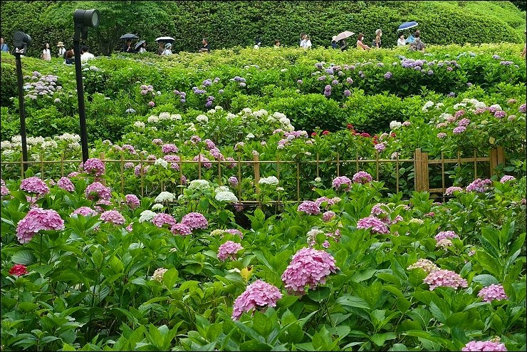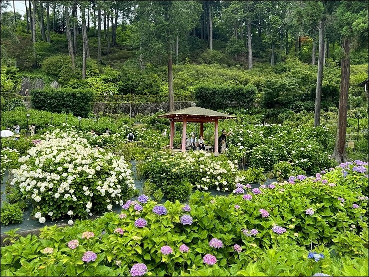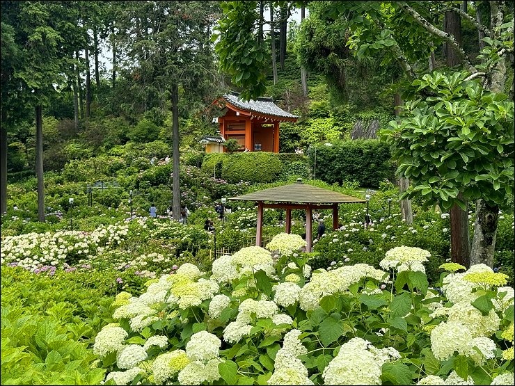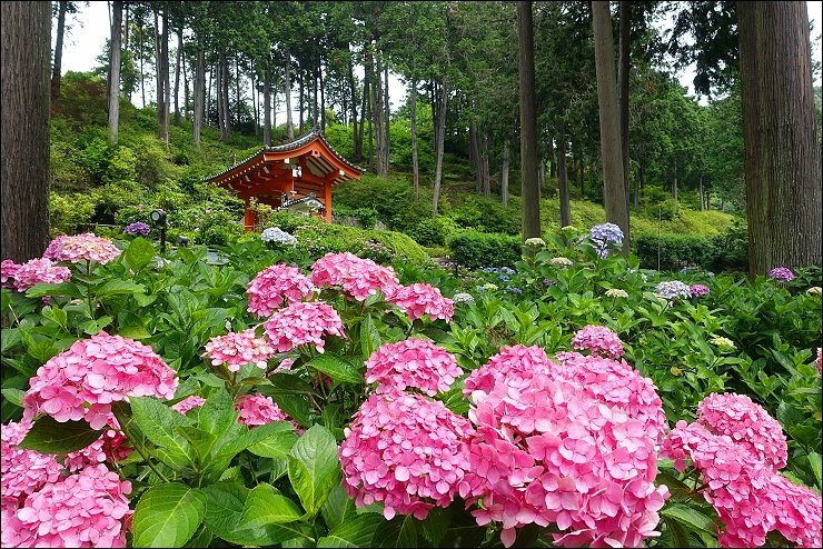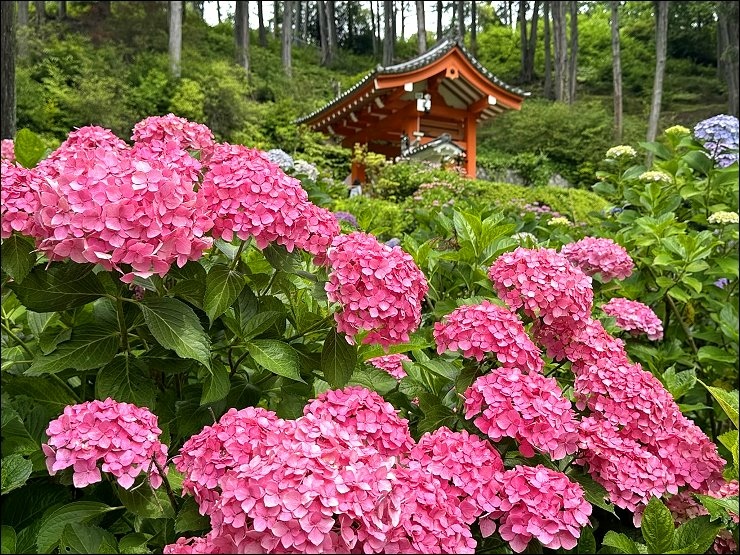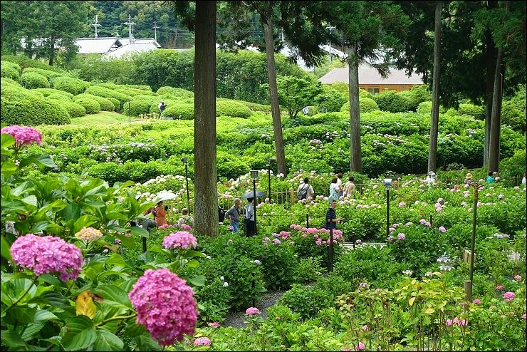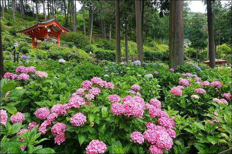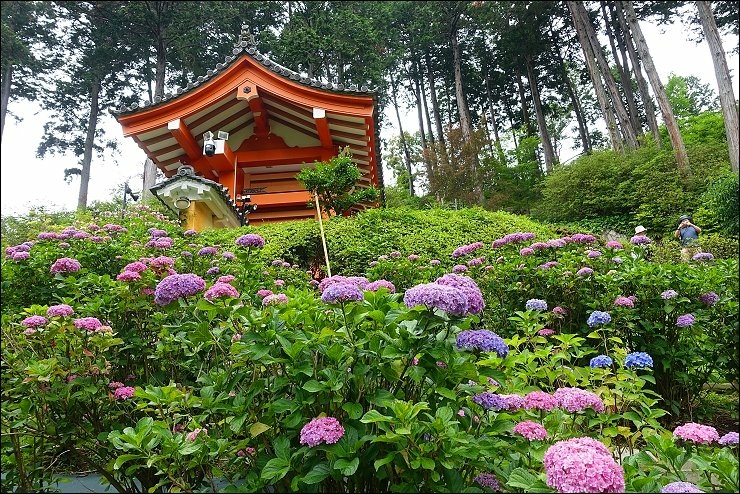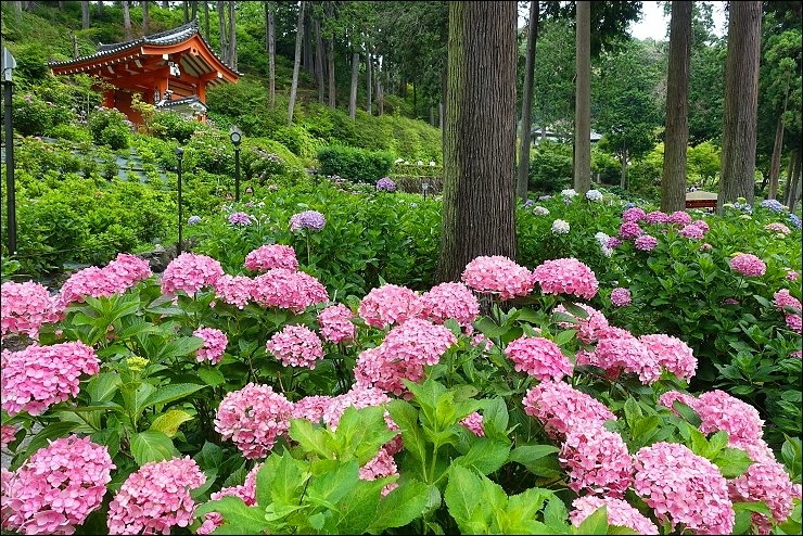 紫色、藍色、白色、粉色、紅色等等繽紛色彩的紫陽花非常漂亮,整個三室戶寺栽種了50種品種,一萬株以上的紫陽花,盛開時滿寺院的繡球花相當壯觀。