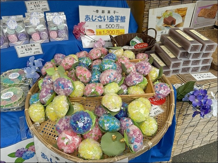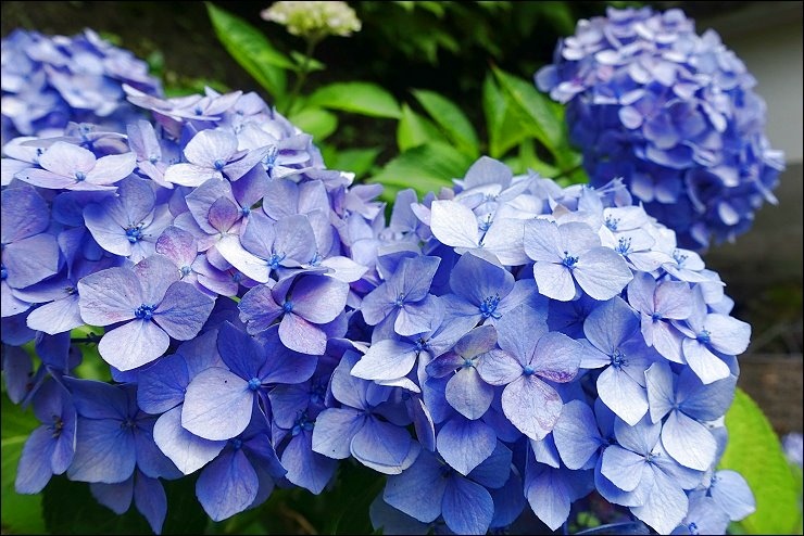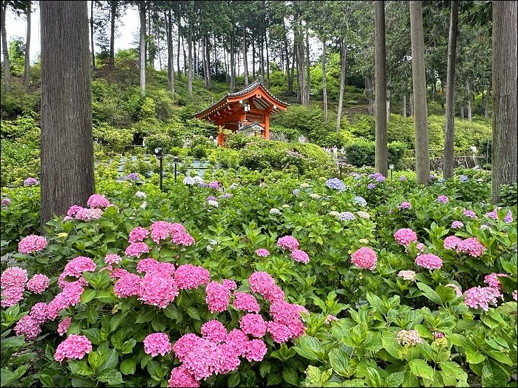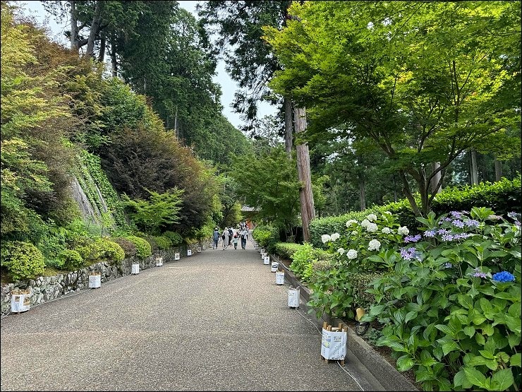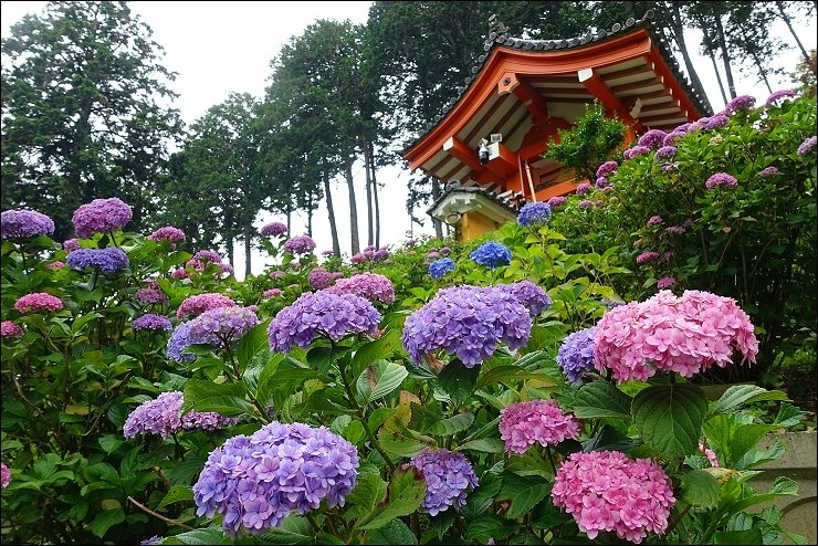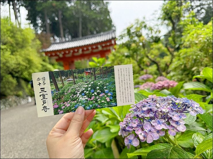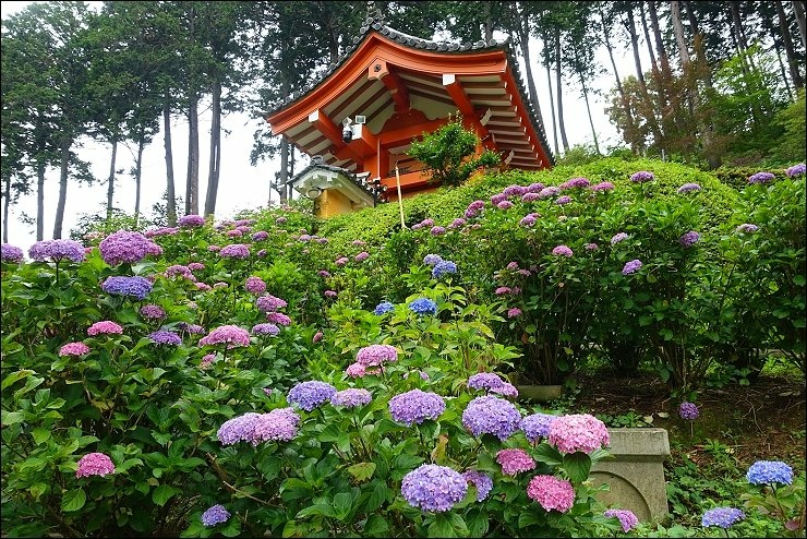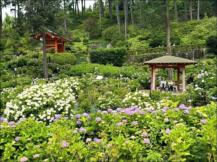 紫色、藍色、白色、粉色、紅色等等繽紛色彩的紫陽花非常漂亮,整個三室戶寺栽種了50種品種,一萬株以上的紫陽花,盛開時滿寺院的繡球花相當壯觀。