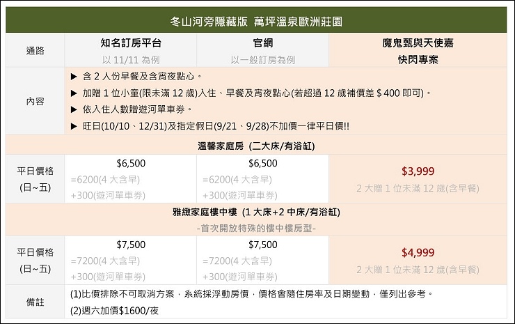 💢宜蘭冬山河旁隱藏版的萬坪溫泉歐洲莊園渡假飯店社團首度快閃,9/19(四)早上十點左右快閃開團!首跨寒假宿期,最親民價格的宜蘭溫泉飯店,不限平假日免費升等二大床溫馨家庭房,一泊二食(早餐+宵夜)最低4千有找,2大加贈1位小童(未滿12歲)含餐飲,超過12歲只需補差價$400。還有首次開放的特殊樓中樓的房型,小朋友跑上跑下最開心。莊園內有溫泉SPA水療館、溫泉足湯池,及超多親子設施(單車、家庭電影院、親子戲水池、生態釣魚池)等,走路5分鐘就到冬山河親水公園,羅東夜市開車10分鐘、傳藝中心開車5分鐘。雙十節10/10、跨年夜12/31,指定週六(9/21、9/28)不加價。
