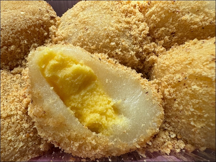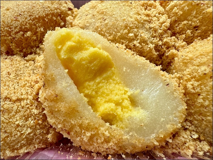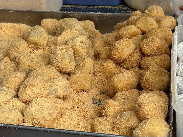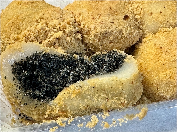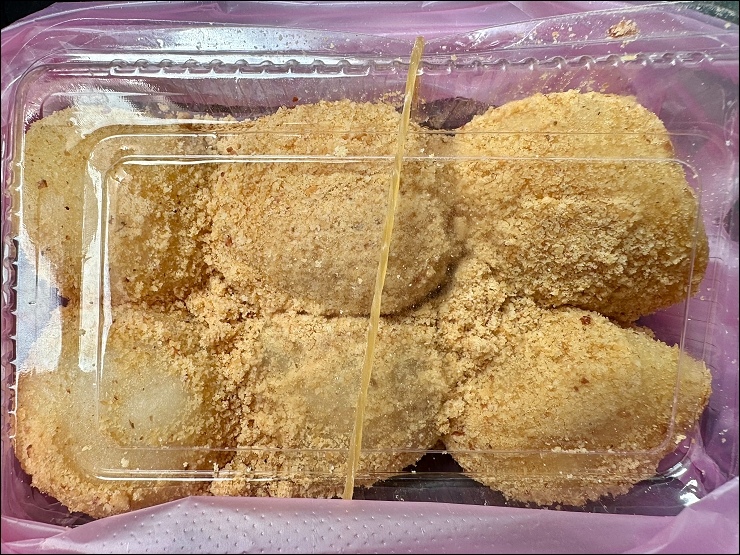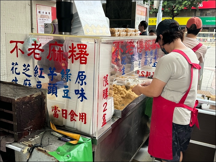 百里香熱炒就在捷運行天宮站出口附近,用完餐路過不老客家麻糬看到不用排隊,外帶幾顆椰香(奶酥)麻糬當飯後甜點也是很合理的事,麻糬有花生、芝麻、紅豆、緣豆、芋頭和原味,單顆12元,一盒6顆70元,每人限購二盒,看估咩的評價完全不會輸給花蓮麻糬的排隊名店。這次買的花生、芝麻和芋頭口味都不錯吃,但大叔團最愛還是椰香口味。