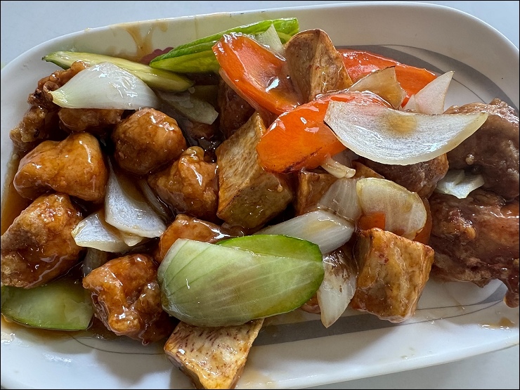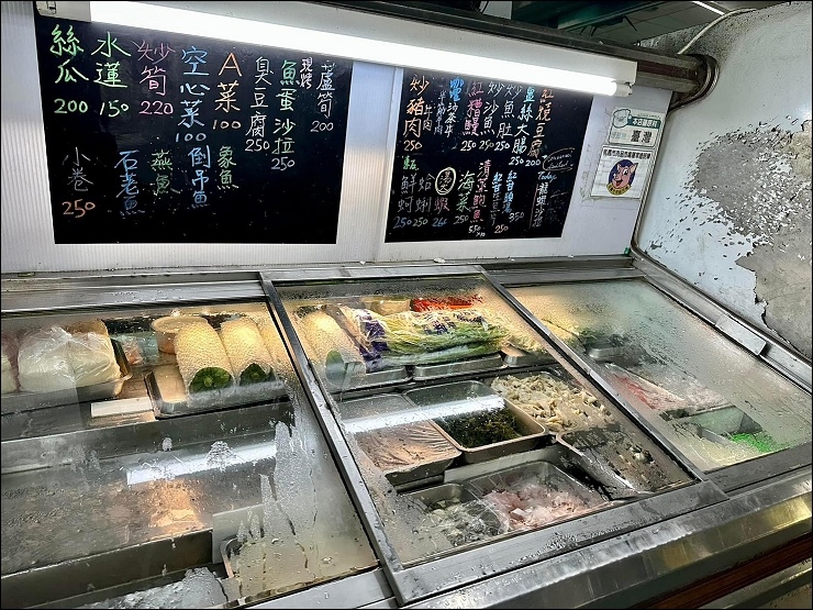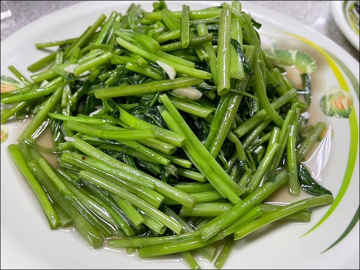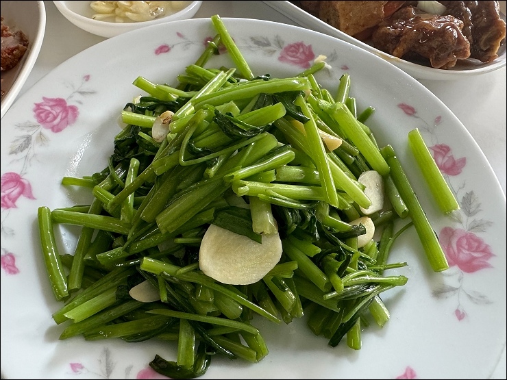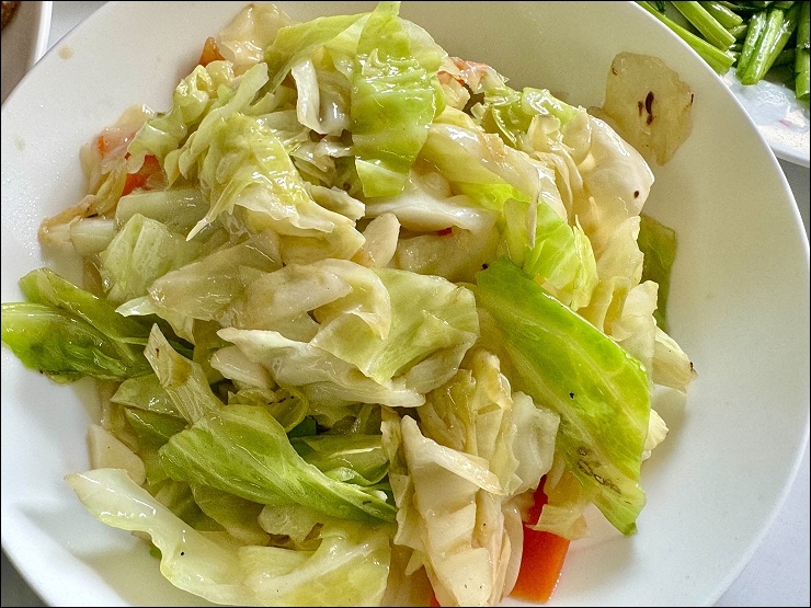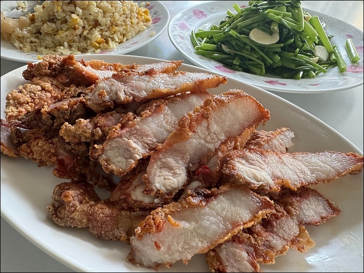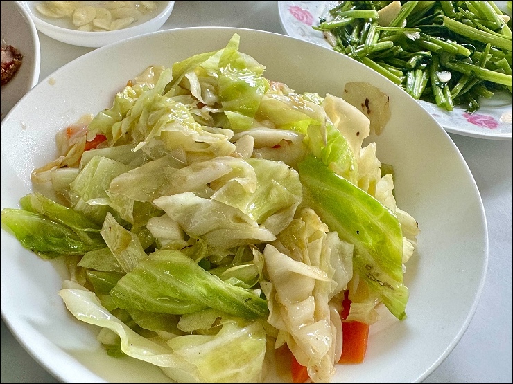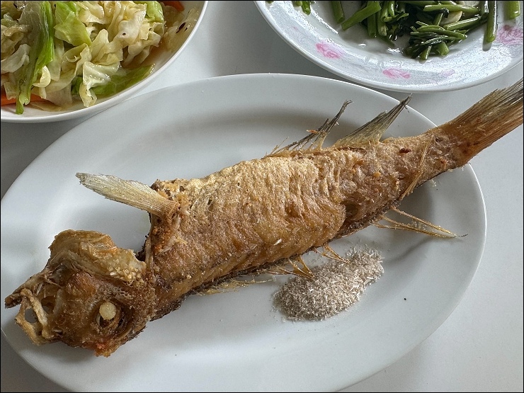 查了估咩地圖推薦必點菜色有肉絲炒飯、什錦炒麵、炒青菜、紅燒肉、糖醋排骨、紅燒豆腐、煎魚或紅燒魚。我們點了肉絲炒飯(鍋氣十足超級推!!!)、肉絲炒烏龍加咖哩(鹹度有點高)、紅燒肉(配醋蒜片吃去油解膩)、糖醋排骨(裡面的炸芋頭好好吃)、炒高麗菜(今天偏鹹)、炒空心菜(好吃)和煎馬頭魚(好像是用炸的/今天這隻個頭不大但很好吃),這餐炒飯+炒烏龍+炒高麗菜+炒空心菜+炸紅燒肉+糖醋排骨+煎馬頭魚、 結帳總共740元有夠便宜的啦!最後要提醒大家,這家口味偏重剛好適合大叔團這類勞力工作者,口味較清淡者建議再考慮一下要不要放進口袋名單。