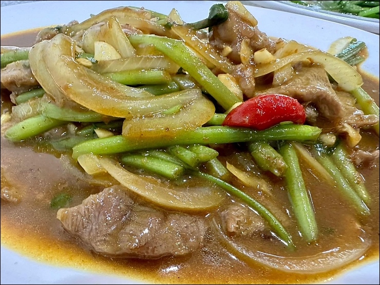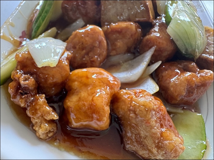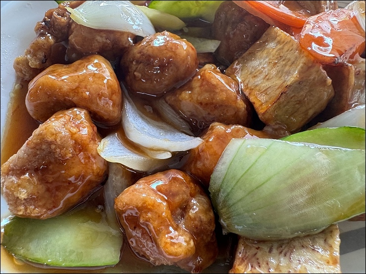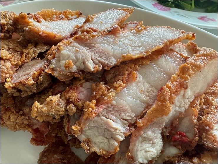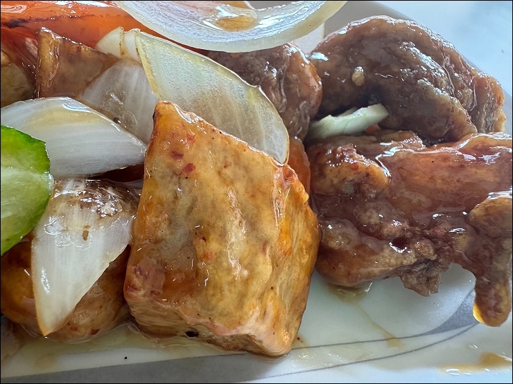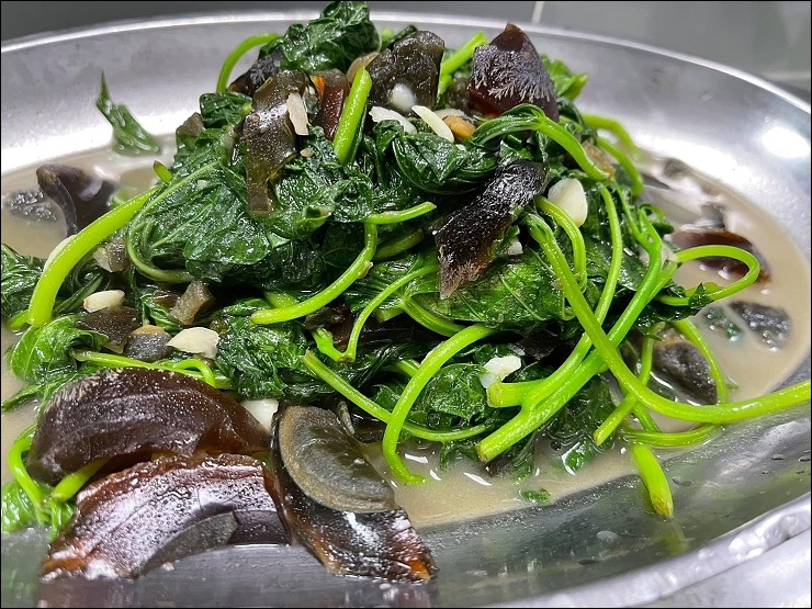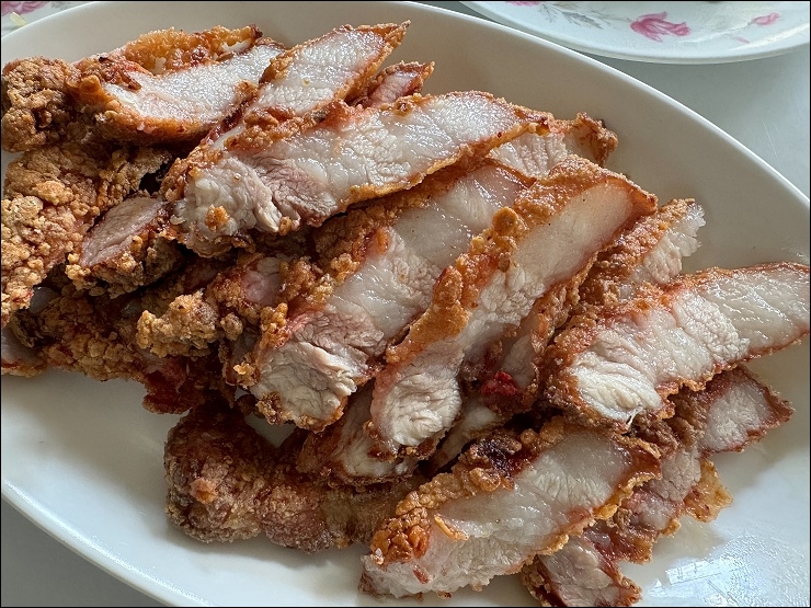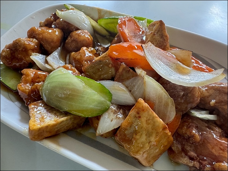 查了估咩地圖推薦必點菜色有肉絲炒飯、什錦炒麵、炒青菜、紅燒肉、糖醋排骨、紅燒豆腐、煎魚或紅燒魚。我們點了肉絲炒飯(鍋氣十足超級推!!!)、肉絲炒烏龍加咖哩(鹹度有點高)、紅燒肉(配醋蒜片吃去油解膩)、糖醋排骨(裡面的炸芋頭好好吃)、炒高麗菜(今天偏鹹)、炒空心菜(好吃)和煎馬頭魚(好像是用炸的/今天這隻個頭不大但很好吃),這餐炒飯+炒烏龍+炒高麗菜+炒空心菜+炸紅燒肉+糖醋排骨+煎馬頭魚、 結帳總共740元有夠便宜的啦!最後要提醒大家,這家口味偏重剛好適合大叔團這類勞力工作者,口味較清淡者建議再考慮一下要不要放進口袋名單。