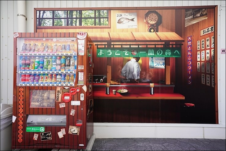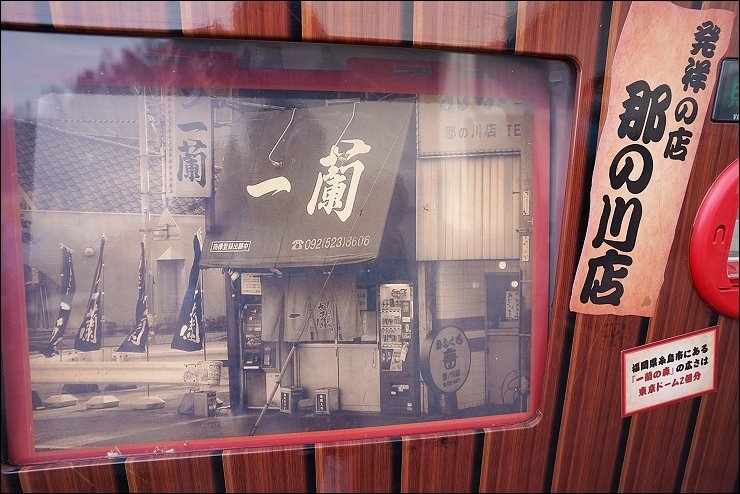 超酷的,連販賣機都是一蘭的外裝!!而且還有一蘭第一間創史店的舊照片,一蘭之森的拉麵攤拍照留念一下!(偷偷說,這邊是在廁所旁@@)