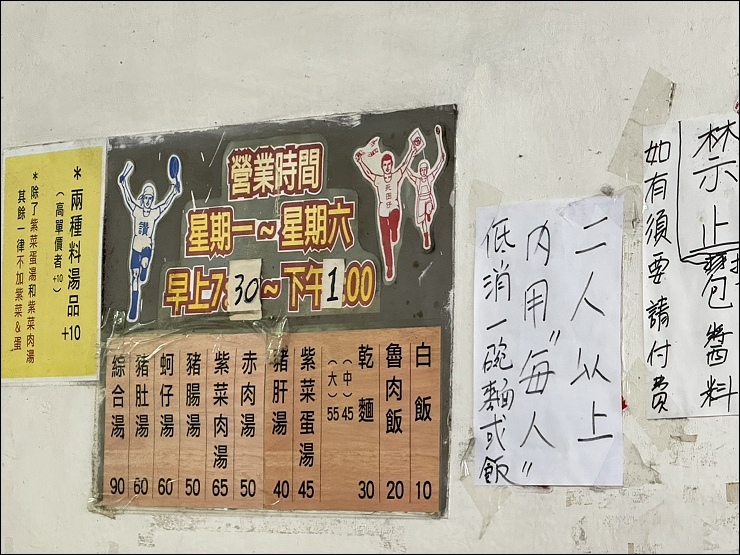 可能是因為綜合湯CP值太高,大家來都只喝湯,店家規定二人以上每人低消一碗麵或飯,魯肉飯和乾麵在基隆孝三路的水平都不算太高(附近好吃乾麵和魯肉飯太多),乾麵比魯肉飯好吃一點,下次來應該會點綜合湯配白飯或乾麵。
