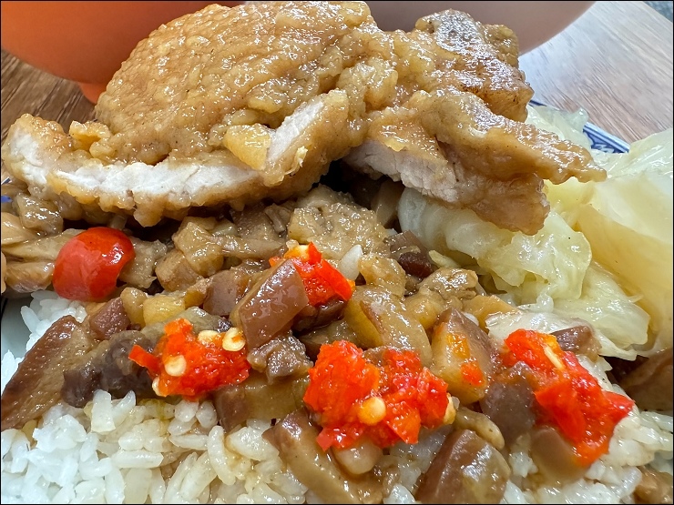 排骨便當會給二樣配菜和菜脯,主角滷排骨、油豆腐、魯高麗菜和菜脯都不錯吃!排骨便當我們還加淋魯肉,敢吃辣的記得加點辣椒。
