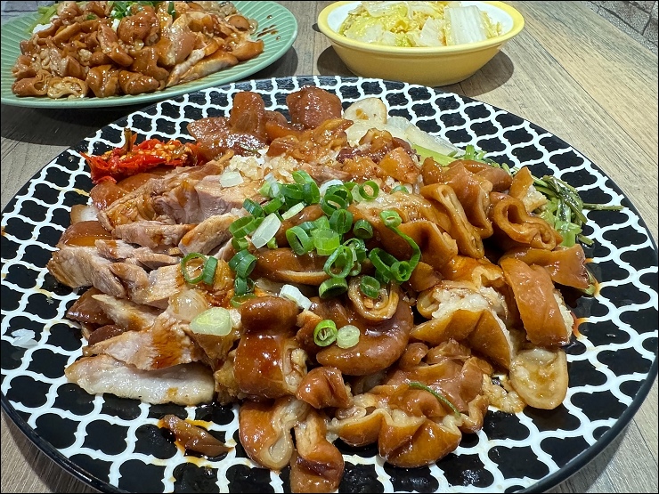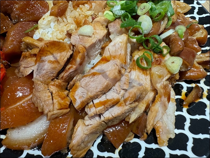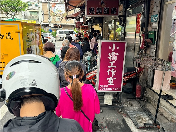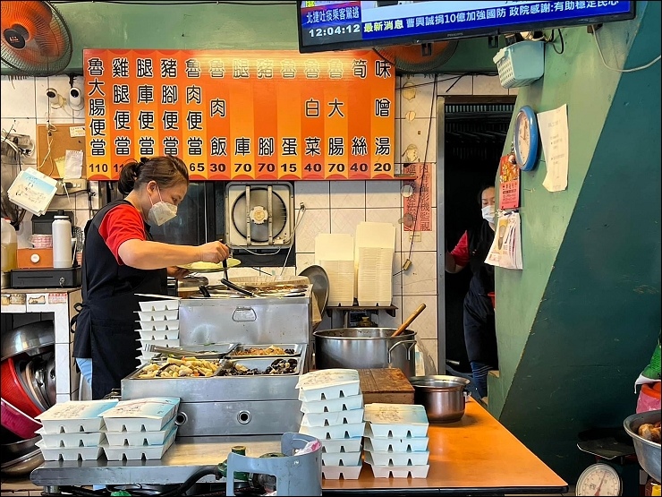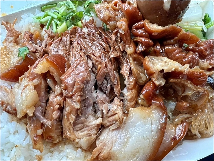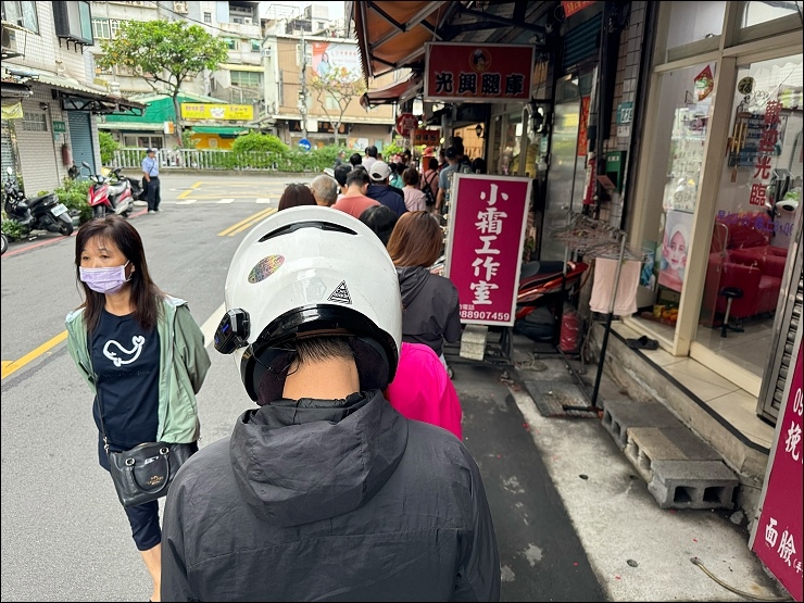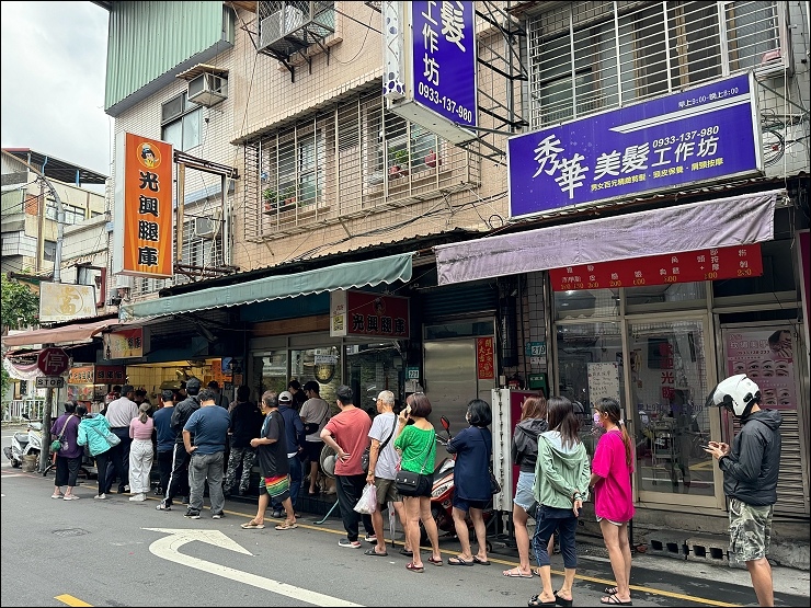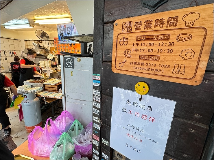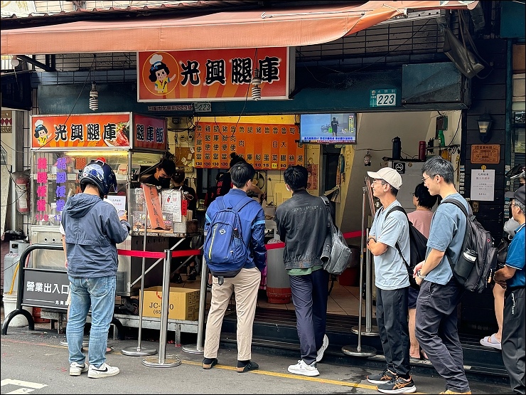 團員留言推薦的三重雙拼便當天花板,腿庫加魯大腸必點,不想排隊超過半小時的話,記得打電話預訂(超過$400)!以前來吃三重光興腿庫都是下大雨才敢衝,沒下雨就去黑白大廚日種元和AI教父黃仁勳推薦的五燈獎豬腳呷甜甜。上次下大雨來偷襲光興前面大約都排10位上下,等到十分鐘左右便當就可入手。昨天又看到團員來留言推薦,今天立馬挑戰地面乾乾來排隊,目測排了30位上下,排隊分成兩排,內用外帶都先排靠右側那排點餐,點完餐外帶再去排左側那排,內用可以直接進去找位子坐,今天11點15分到,11點33分點到餐入座,11點50分便當端上桌,內用排隊到開吃大約等35分鐘,這裡超過九成是外帶,不到一成內用。切記超過$400可以先電話預訂啊~~~