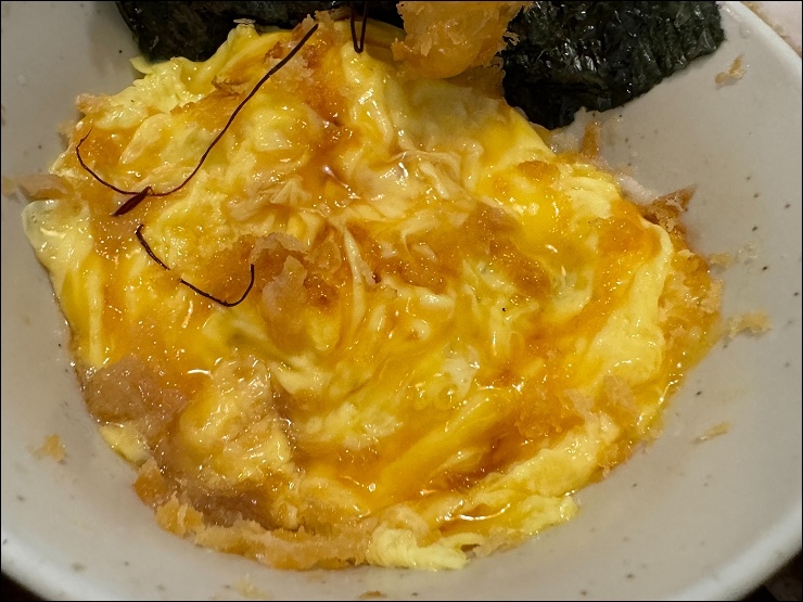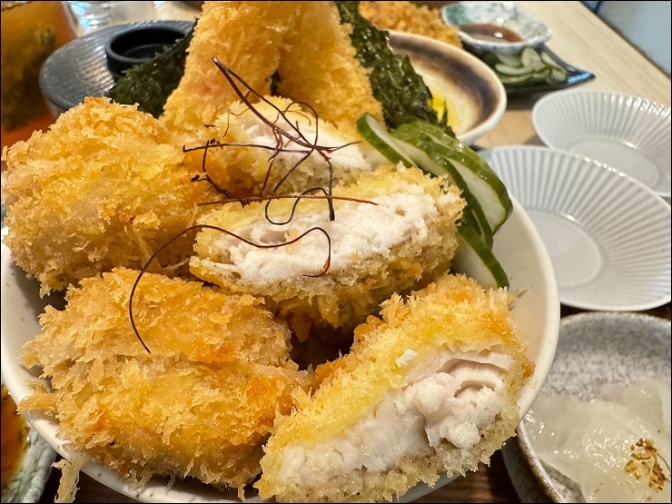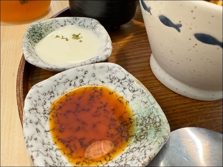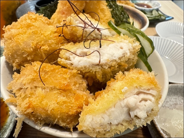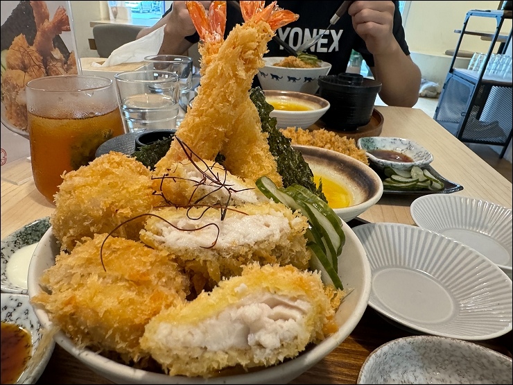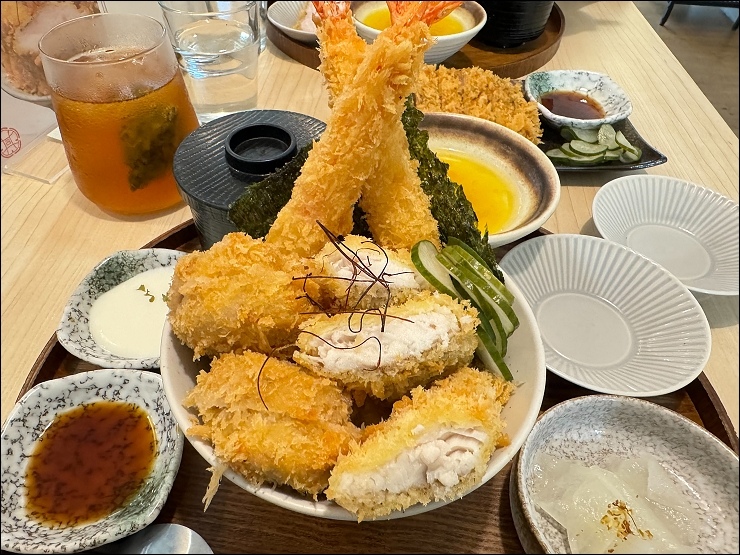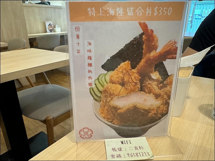 不在菜單內的特上海陸盛合丼$350,這個豬排是腰內肉,炸蝦和炸魚海鮮類會多一種沾醬。