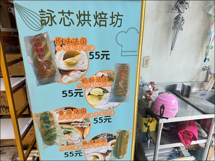 詠芯烘焙坊是號稱金時代法國麵包的平替版,店址在大同路279號(幼兒園旁),不在龜山后街商圈,離金時代比較遠,路過想吃有開就有得買,也有賣其他麵包,我們買了原味、香蒜和奶酥三種口味的法國麵包都不錯吃,至於毛毛蟲的奶油餡我家就比較吃不慣(純粹個人口味問題)。