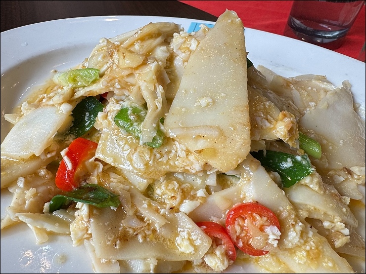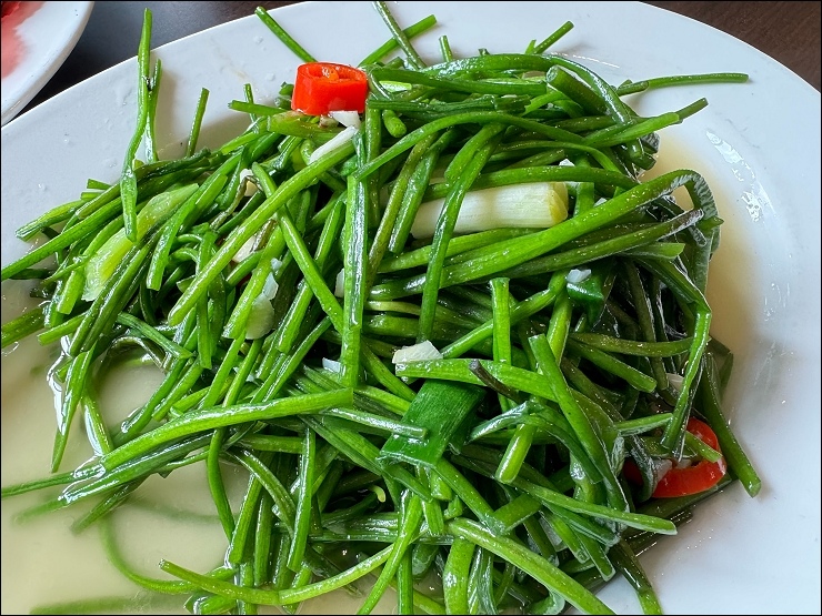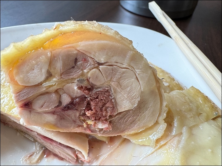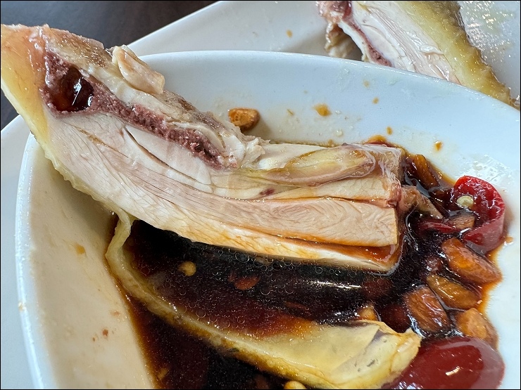 今天只有二個人來,店員說可以點半隻雞作兩吃,雞翅雞腳骨頭多的部位拿來煮竹筍雞湯,雞湯幾乎每桌都打包回家晚餐加菜,白斬雞雞皮有凍不錯吃,但今天這盤雞毛感覺沒有拔乾淨扣了不少分。