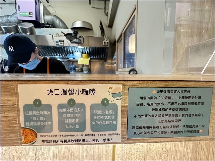新北塞車耶誕城排隊懸日拉麵,隱藏於板橋車站萬坪公園對面的果香系雞白湯拉麵店,店內只有7個座位,內用限時30分鐘,拉麵上桌後才開始倒數計時,松露餛飩先推一個,拉麵依不同口味裡有檸檬片、柳橙片、鳳梨片和苦瓜都勇敢入菜,然後還會附超小一塊飯後水果XD