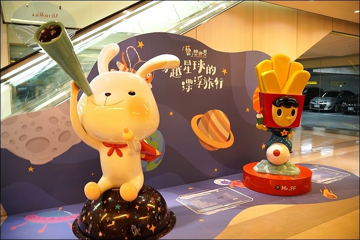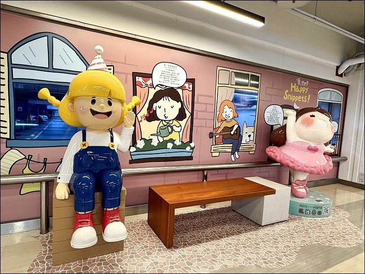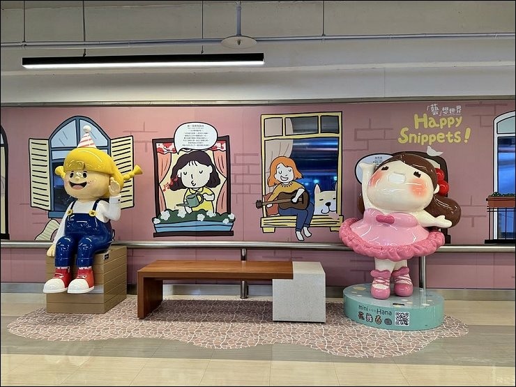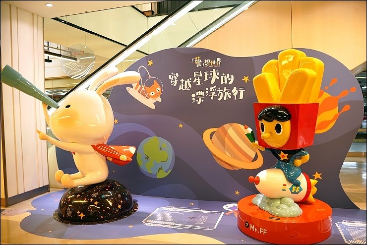 手扶梯搭下樓竟然還有一區藝想世界,大型可愛的公仔好吸睛,大家紛紛在這拍合照!色彩鮮艷又豐富,在窗邊彈著吉他,狗狗寵物在身邊、媽媽在幫她的植栽澆花好悠閒,生活不就是該如此輕鬆自在嗎?!