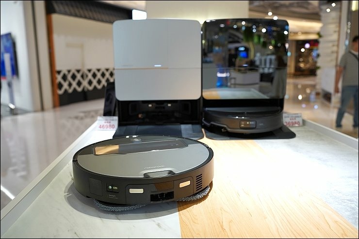 Roborock石頭科技 (GBF樓),全球三大掃地機器人製造商,專攻掃地機器人科技,目前為台灣掃地機器人銷售市占第一的品牌。Saros Z70全能機械手臂旗艦掃拖王者,特價46,980元(原價69,999元),店員拿起手機APP直接操控掃地機器人,不但秀出它折疊式五軸機械手臂撿垃圾,辨識物品並放置指定位置,號稱會觀察和思考的機器手臂,還能全視角記憶打掃空間與動線,自動集塵箱清空、80度熱水自動清潔、55度熱風烘乾等等功能,真的好強大,拖地打掃的工作交給這台就好。