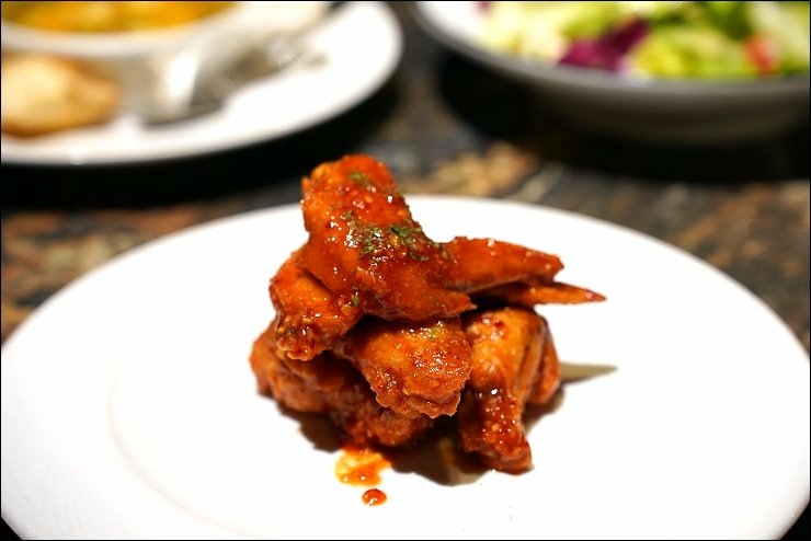 洋釀炸雞翅(180元),炸過的雞翅裹上醬汁,口感比較溼,口味偏甜微辣。