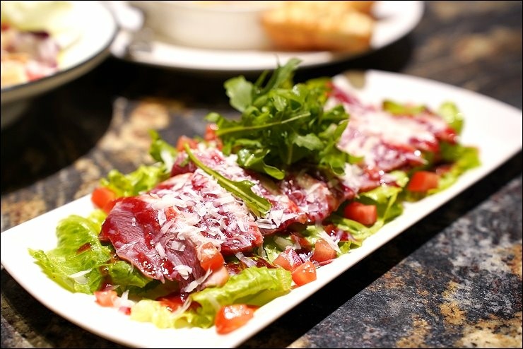 煙燻鴨胸佐覆盆子醬(180元),鴨胸肉質有嫩,煙燻過口味比較重,搭配生菜跟起司清爽提味。
