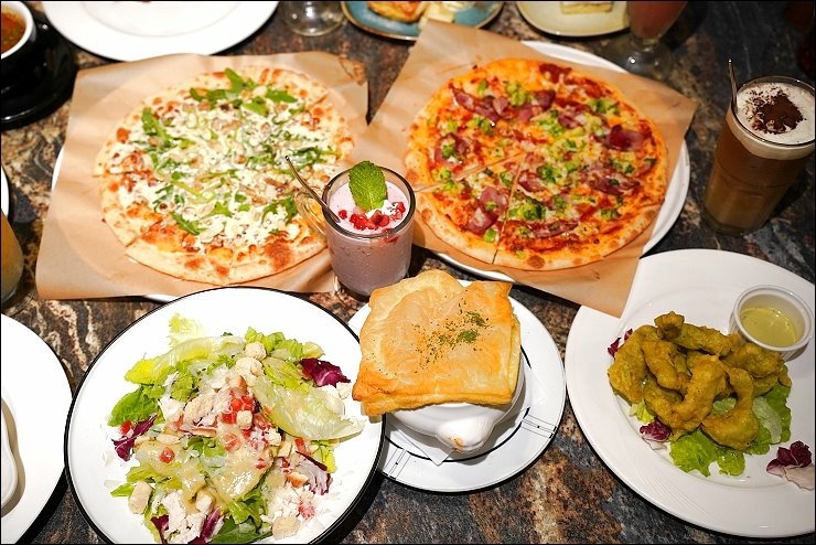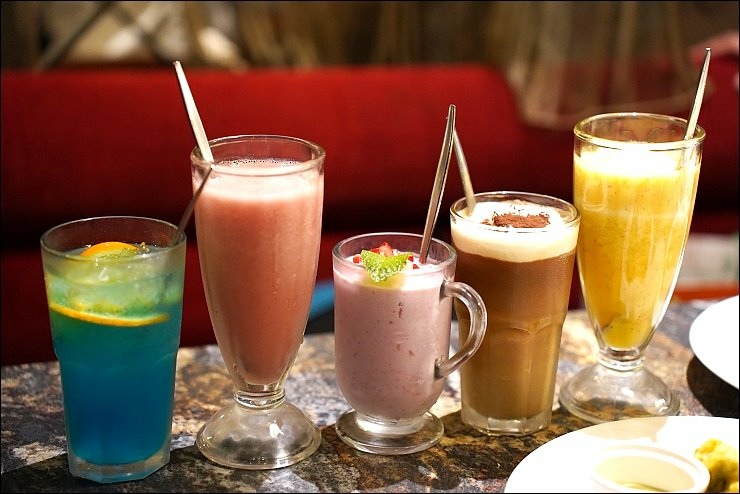 飲料選擇也很多,特調、奶昔、咖啡、氣泡飲、還有雞尾酒,由左到右是藍色珊瑚礁、紅心芭樂檸檬汁、野莓雙淇淋乃昔、拿鐵跟紅心芭樂氣泡飲,我喝濃醇鳳梨蘋果汁,好喝!