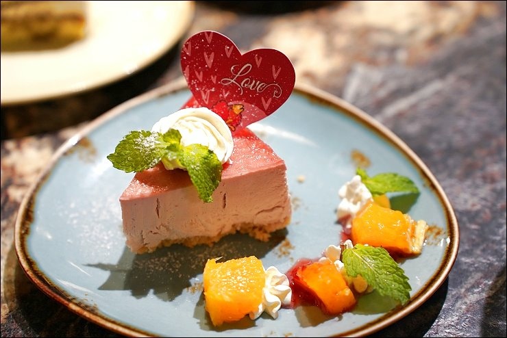 蛋糕裡頭也不馬虎,覆荔花束蛋糕裡頭有新鮮水果,外層的覆盆莓口味奶油吃起來酸甜好滋味。