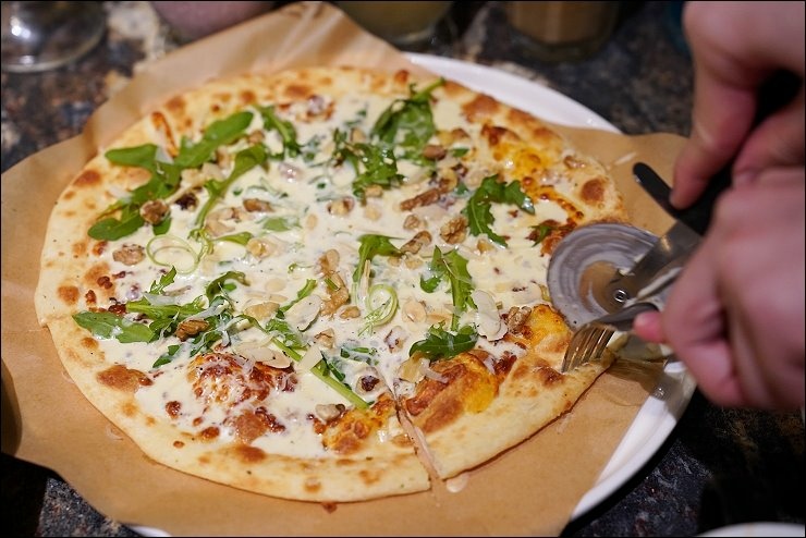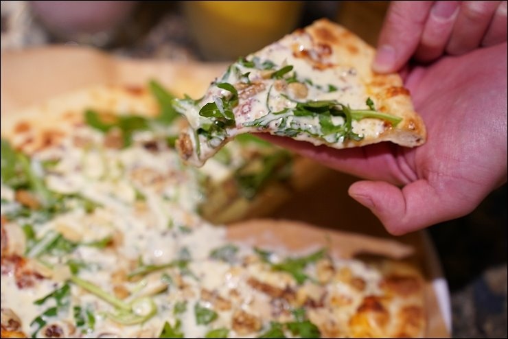 藍紋乳酪芝麻葉比薩(260元),一烤好就上桌,現切現撒楜椒粉,很有貴賓的排場,哈哈!薄皮的披薩吃起來很舒服,濃濃的乳酪加上芝麻葉,還有加一點堅果,吃起來很清爽又很香,我滿喜歡的,硬要說缺點的話就是乳酪水了點。