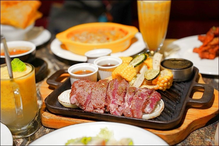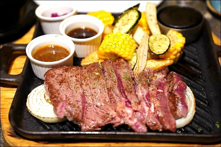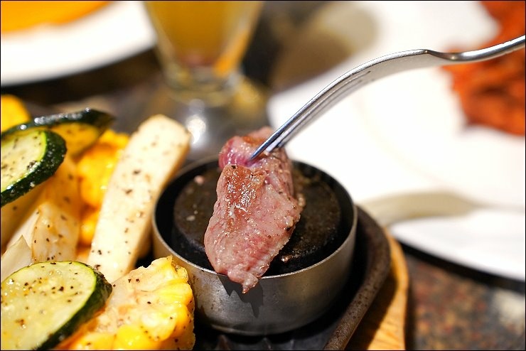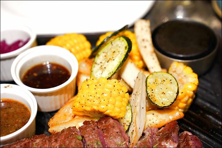 配菜搭了幾樣烤時蔬,有好吃的櫛瓜、杏包菇、玉米,牛排吃一吃,牛排底下的洋蔥也好甜!
