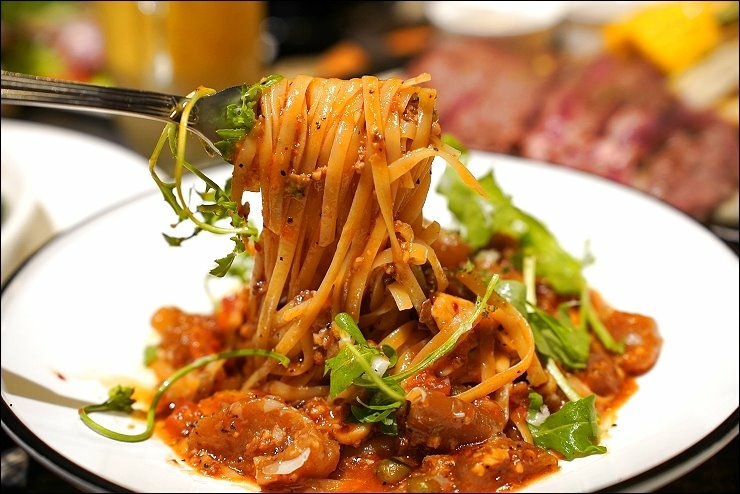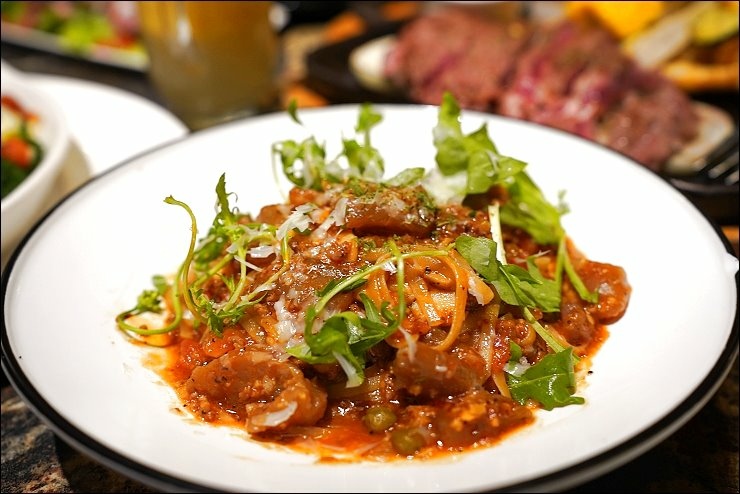 精燉牛筋辣味波隆納肉醬起士扁麵(460元),牛筋入口即化,義大利麵吸附醬汁,微辣,我最愛這味,一口接一口!