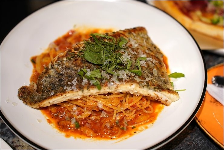 先隆重介紹三道義大利麵都是母親節慶菜色,這道香煎鮸魚、蟹肉蕃茄義大利麵是母親節限定菜色,一上桌就把大家嚇到,這片魚也太大片了吧!皮也煎的赤赤的,魚肉也很細,蕃茄紅醬義大利麵很安全,好吃!推薦點給牙口不好又愛吃魚肉的長輩享用!