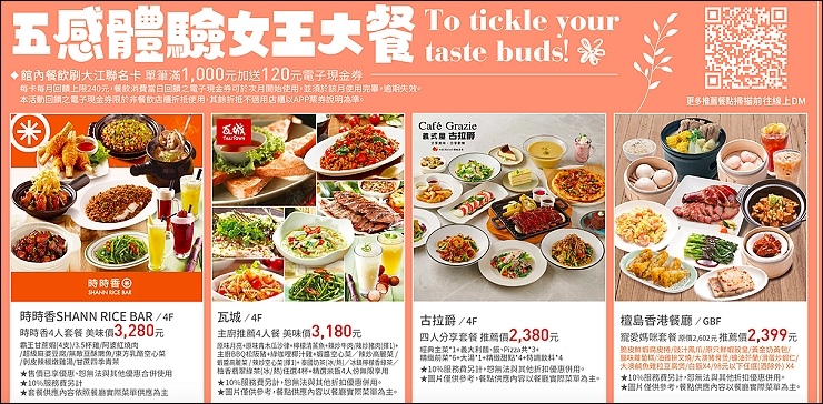 大江聯名卡好食力,刷大江聯名卡全館餐飲單筆滿仟送120元電子現金券(每月回饋最高240元電子現金券)。