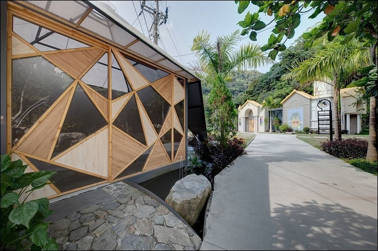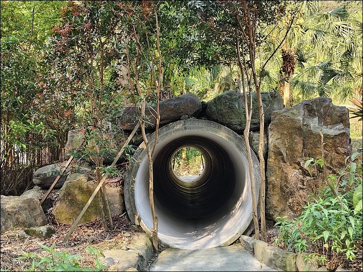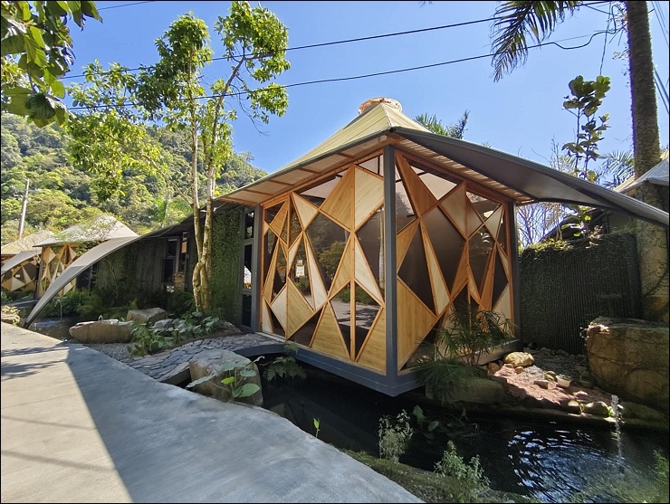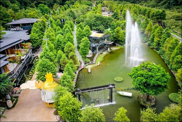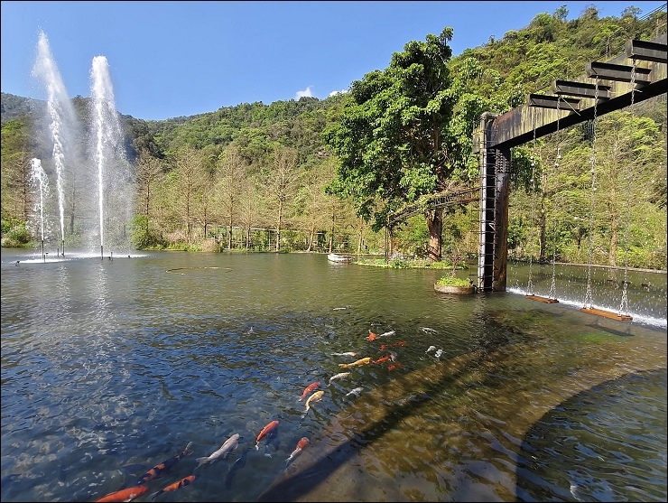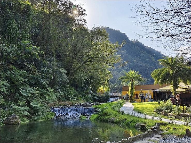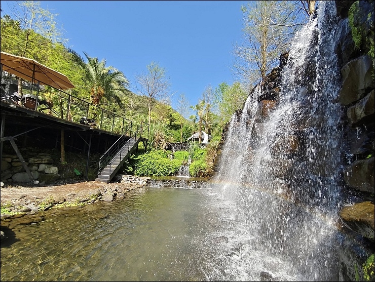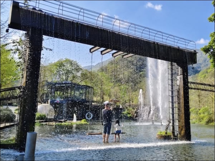 以水貫穿園區,10 幾個大小瀑布,引進山泉水打造大人小孩皆適合的兩座戲水池。