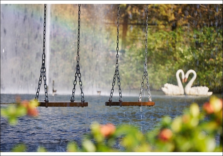 超好拍的夢幻瀑布盪鞦韆、彩虹月亮躺椅、噴水池、落羽松大道。