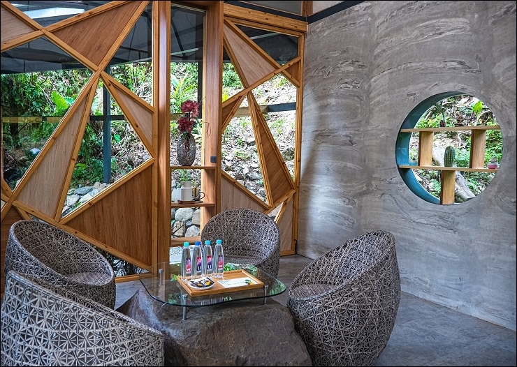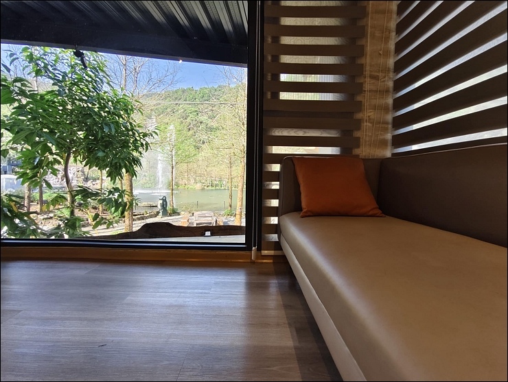 很喜歡這裡,它的設計是你可以脫鞋赤腳,坐在這邊,聽著小瀑布水流聲,享受被山水包圍的悠閒。