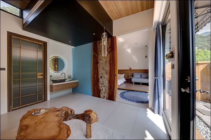 庭院自然流水造景,室內偏木質調風格