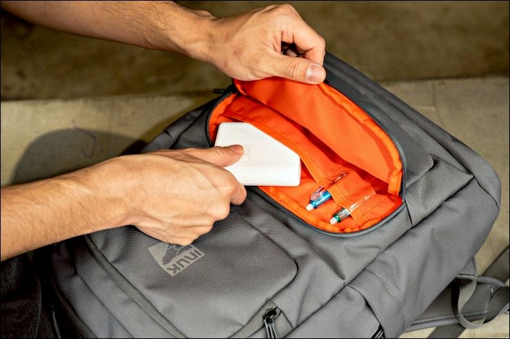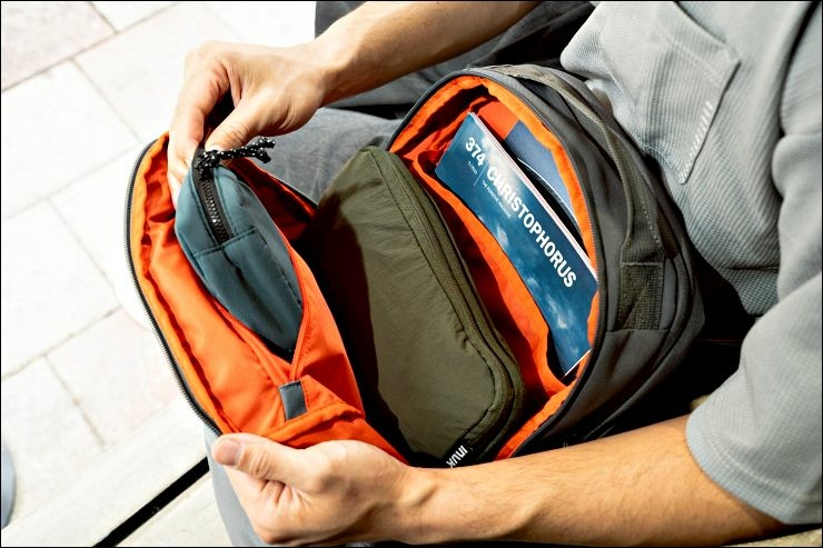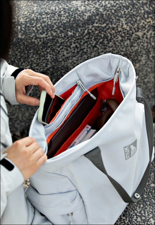 『就剛好我帶的所有東西都有一個很好拿取的位置,護照單獨放在側邊的隱藏拉鍊裡,前面下方的袋子夠大可以放衛生紙、環保購物袋,裡面的分隔還可以剛好放置我的行動電源跟線,旁邊還有一個分隔插一隻隨時可以用到的筆。