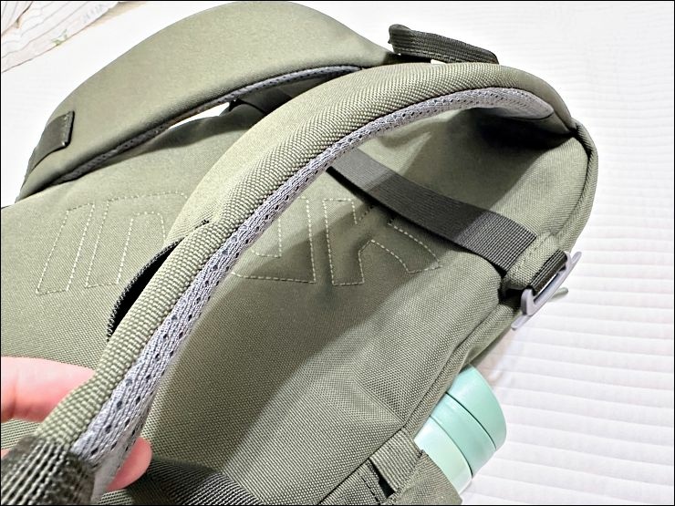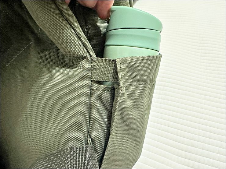 兩邊的側袋夠寬,一個可以放伸縮卡套,隨時都很方便掏出來刷卡,另一邊的側袋天氣好的時候放水瓶,隨時有水喝。天氣不好的時候進室內可以放摺疊雨傘,不用一直拿手上;