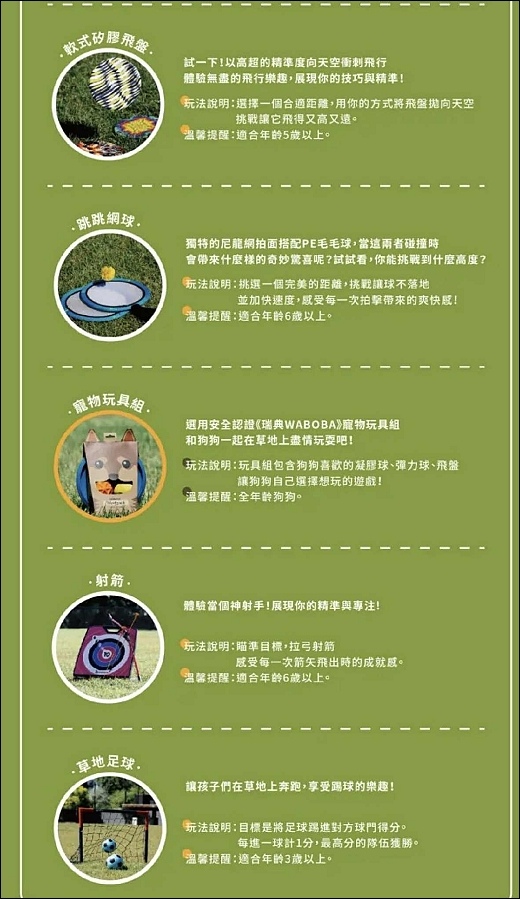 毽子球拍、草地排球、軟式矽膠飛盤、跳跳網球、射箭、草地足球、寵物玩具組