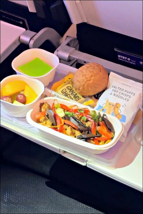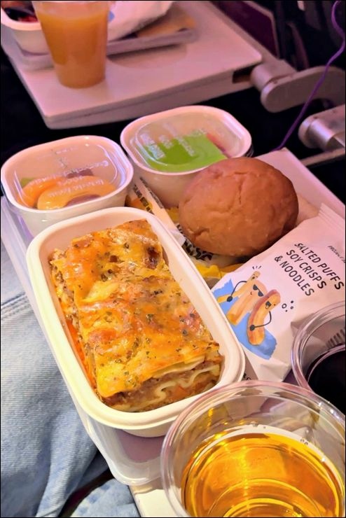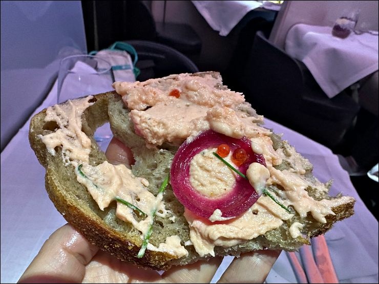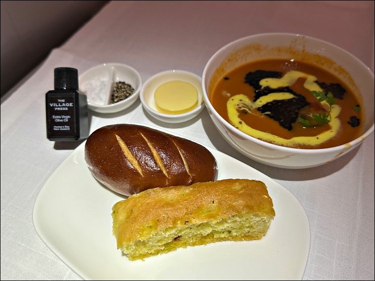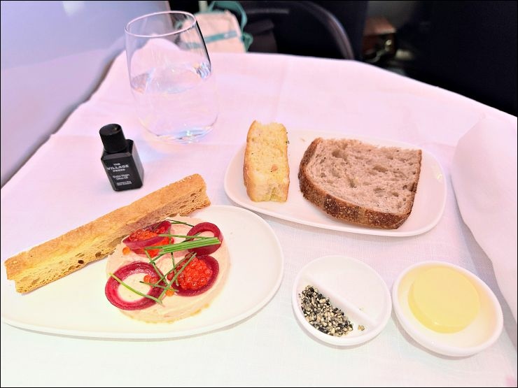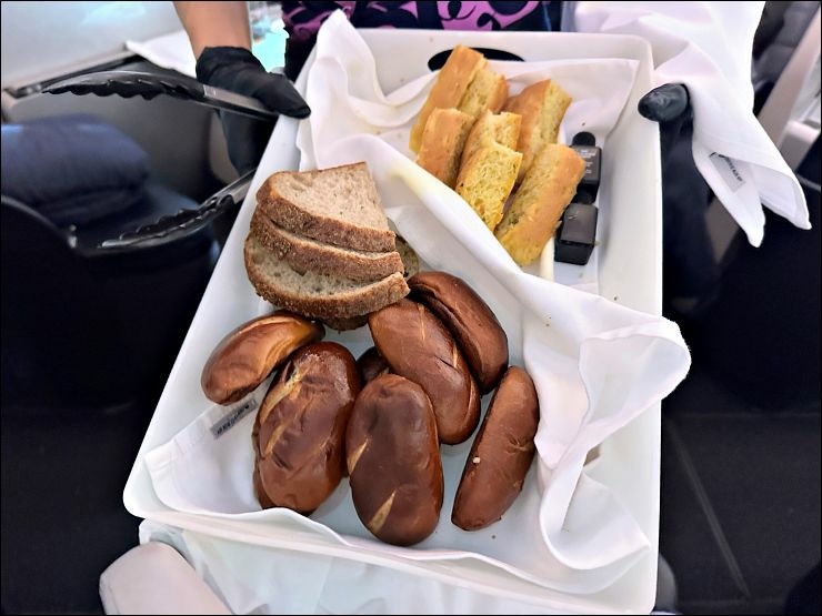 不一會兒就到了用餐時刻,又是我最愛的餐前麵包,還會附小瓶橄欖油喔,用不完我們都會帶下機,因為超市都賣好大一瓶,機上帶下去的食物也要記得申報喔。