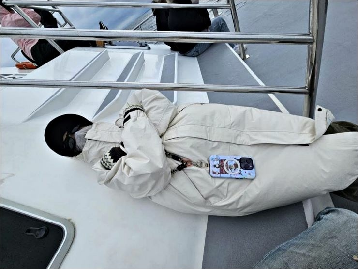 回程不敢回吐成一團的船艙內,只待在後方甲板包毛巾休息(還真睡著),全程沒喝一口水,只吞2顆薑糖全身而退,可惜只有看到兩波愛玩耍不同種類的海豚,沒看到在噴水的鯨魚。