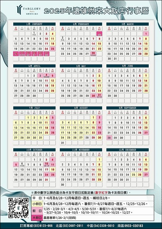 花蓮遠雄大飯店2025平日/小假日/假日/大假日 行事曆