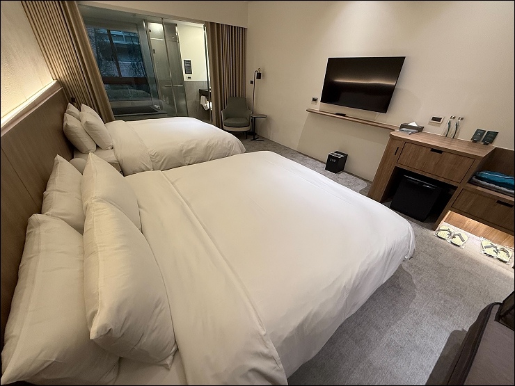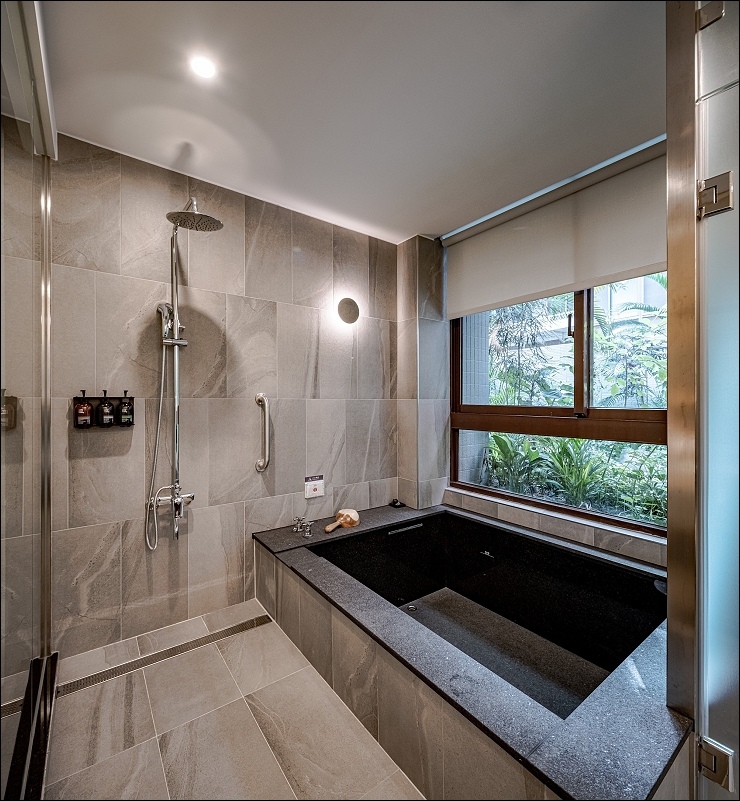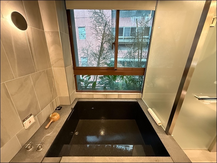 房間裡面就有獨立隔間的廁所和美人湯池,湯池感覺有點半降板的設計,進出蠻容易的,TOTO馬桶用料高級,比較可惜的是,我們住的這間靠隔壁大樓比較近,沒辦法窗簾大開享受陽光綠意~~