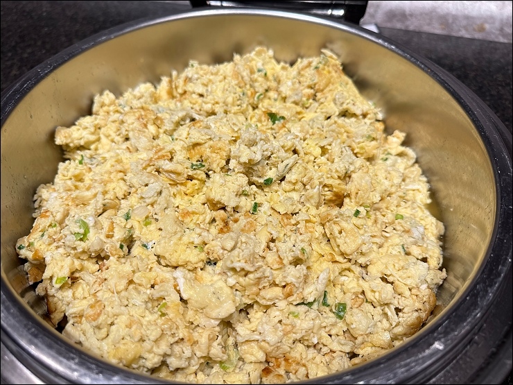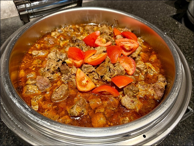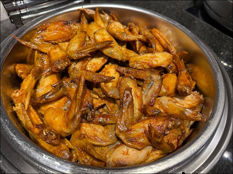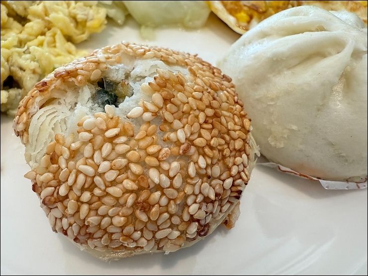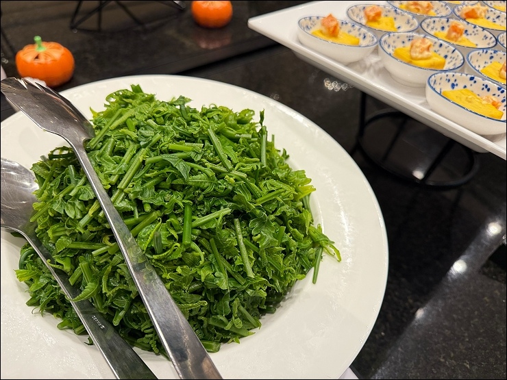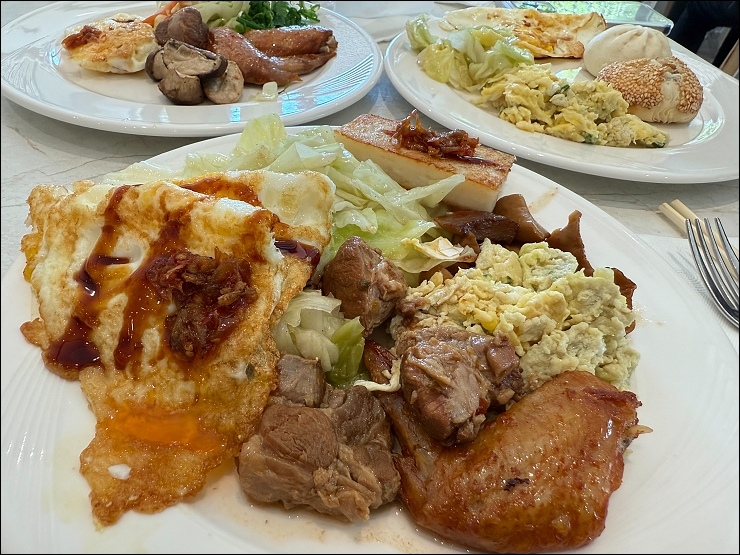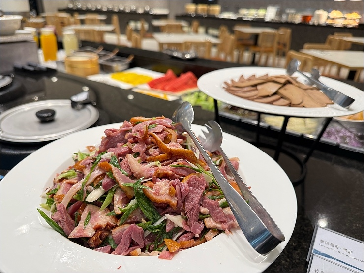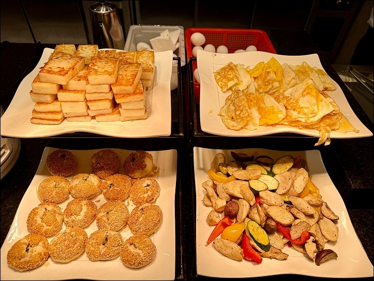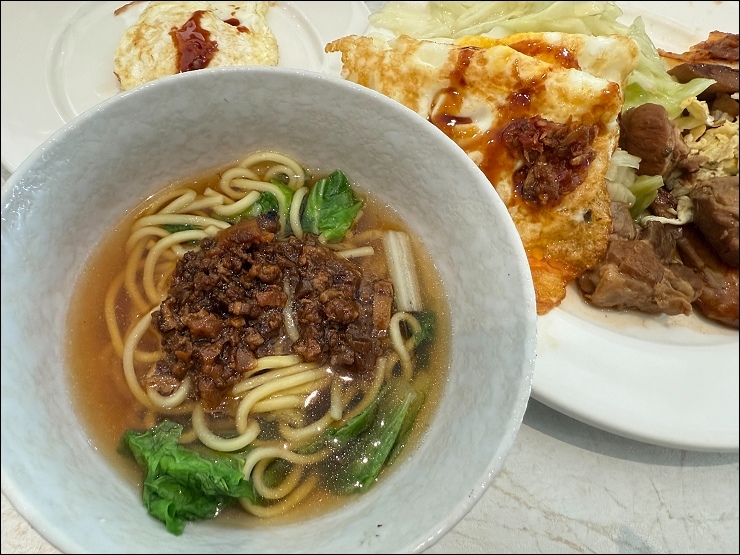 我們入住當天的自助吃到飽該有的都有(特別提醒:因冠翔泉旅房間數不多,若當日住客較少,早餐餐型會改成九宮格式供應!!),三星蔥燒餅、三星蔥炒蛋、溫泉蕃茄豬腳、香蒜鴻鴨賞、蘭陽膽肝等宜蘭特色美食也有,蘿蔔糕旁的辣椒醬超讚,一定要加。